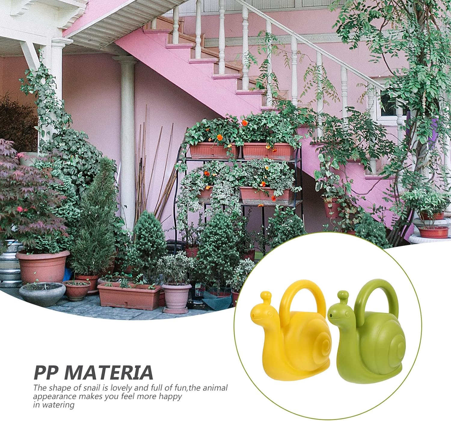 Description This is a set of watering pots, which are made of high- quality materials, durable and rustproof. Ideal for indoor and outdoor plants, keeping plants and flowers moist and thus healthy. The snail shape makes these watering pots lovely and exquisite. Share with your friends and family as it is a wonderful housewarming gift. Features- Color: Green, yellow.- Material: PE.- Size: About 23. 00X20. 00X13. 00cm/ 9. 04X7. 86X5. 11in.- Adopts high- quality, environmentally friendly and nontoxic PP material, plastic watering pots are practical, durable and not easy to damage.- Functional watering pots can be used on potted plants and ferns indoors or on your vegetables in the garden.- The spout of the watering pot has holes that allow easy drainage and almost no leakage during irrigation. It is perfect for both large and small flowers.- Kids will love watering plants with this super cute watering can. Reasonable handle design is comfortable and after use will not feel tire.- The shape of snail is lovely and full of fun. The animal appearance makes you feel more happy in watering. Package Including 1 x Set 2Pcs Watering Pots